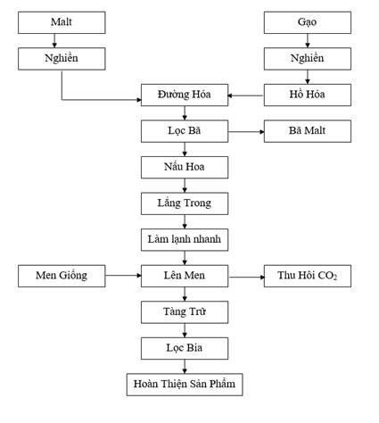 Quy trình này gồm chuẩn bị nguyên liệu → đường hóa → nấu hoa → lên men → tàng trữ → lọc → đóng gói, tạo ra bia có hương vị đặc trưng.