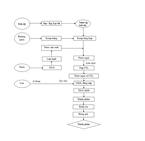 Quy trình này gồm xử lý nguyên liệu (trái cây, đường, nước) → pha chế → làm lạnh → nạp CO₂ → chiết rót → xử lý nhiệt → kiểm tra → đóng gói, để tạo ra sản phẩm nước ngọt có gas.