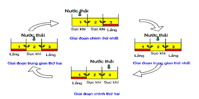 + Pha chính (1): Nước thải được đưa vào ngăn bên trái ngoài cùng (ngăn A) lúc này đang được sục khí. Nước thải mới được đưa vào được trộn lẫn với bùn hoạt tính. Các hợp chất hữu cơ, tác nhân gây bẩn cho nước bị hấp thụ, phá vỡ một phần bởi bùn hoạt tính (quá trình tích lũy). Từ ngăn A hỗn hợp bùn nước liên tục chảy vào ngăn B cũng đang được sục khí. Tại đây vi sinh tiếp tục phá hủy các chất hữu cơ đã được đưa vào và được hấp thụ ở ngăn A (quá trình tái sinh). Cuối cùng, hỗn hợp bùn nước được chuyển sang ngăn C, lúc này ngăn C không sục khí cũng không khuấy trộn mà đóng vai trò như một bể lắng, tạo điều kiện yên tĩnh cho bùn sa lắng dưới tác dụng của trọng lực. Từ ngăn C, nước thải đã được trào qua máng răng cưa vào kênh nước sạch, bùn dư cũng lấy ở đây, tại ngăn C.